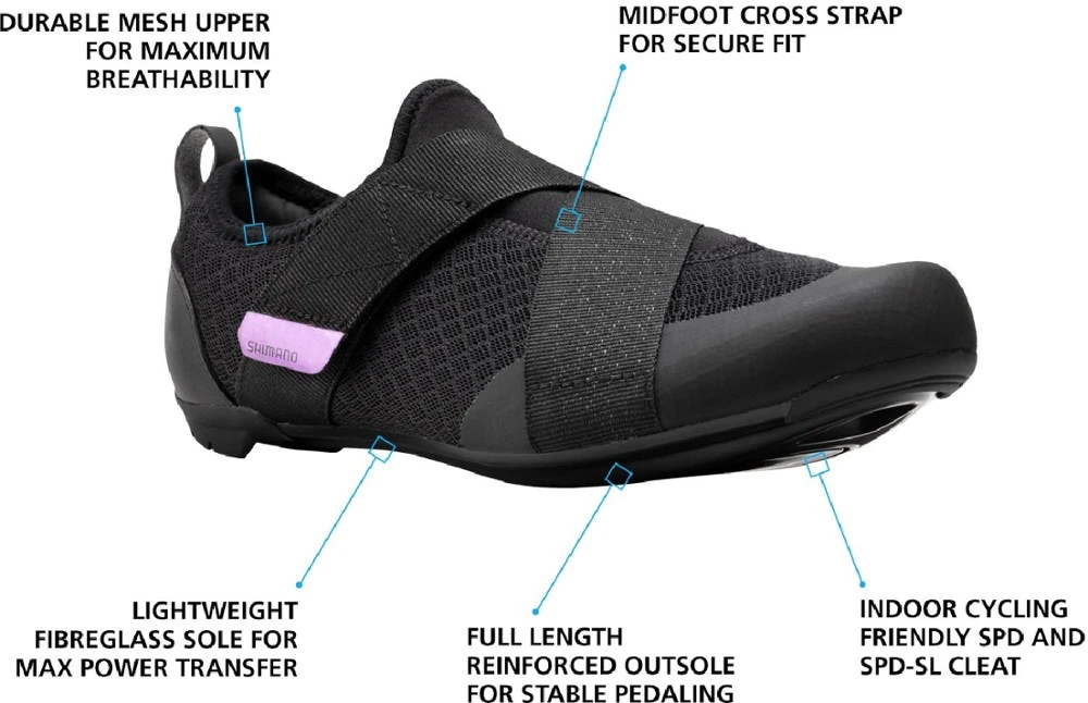 Designed with breathable sock mesh uppers for high-intensity workouts, the women’s Shimano IC1 indoor cycling shoes are cool, comfortable and ready to work up a sweat.
