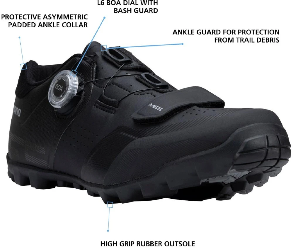 Built for trail performance and off-the-bike traction, the men’s Shimano ME5 mountain bike shoes feature offset tongues and Boa® closures for improved comfort and stable, efficient pedaling.