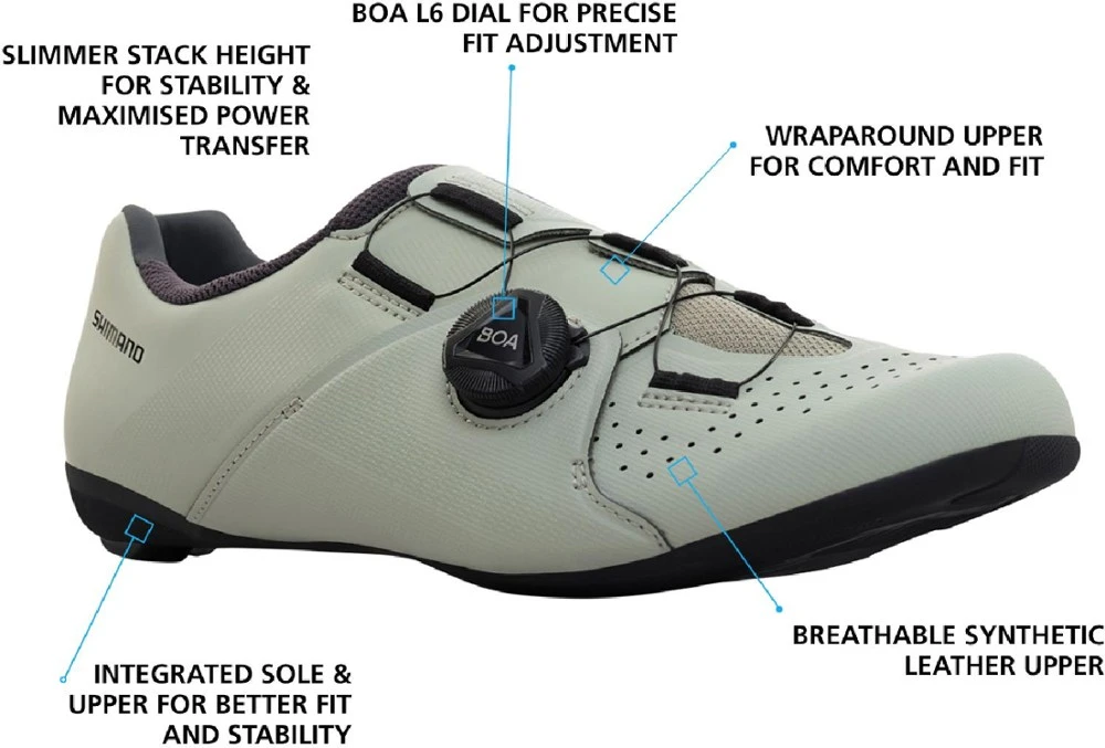 With their seamlessly integrated midsoles and uppers, the women’s Shimano RC3 road cycling shoes set a new benchmark for fit, stability and lightweight performance.