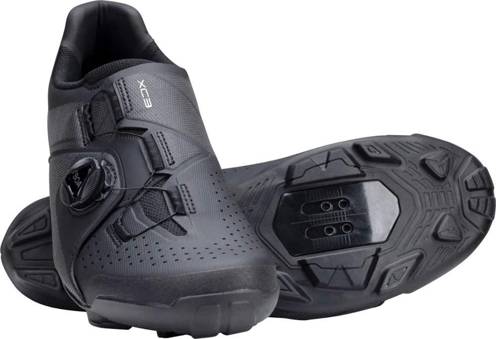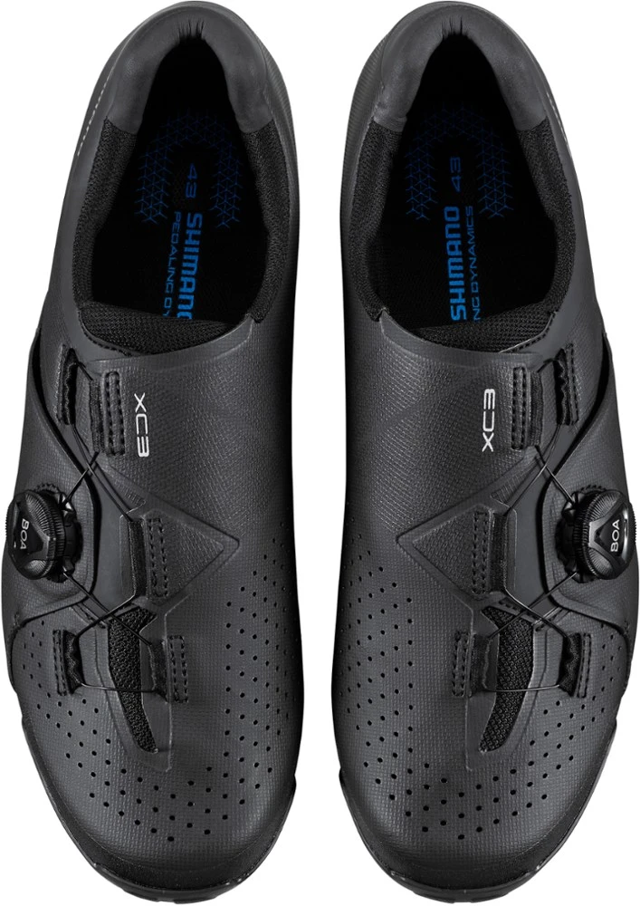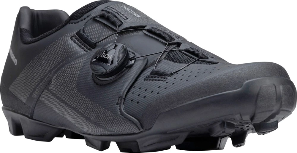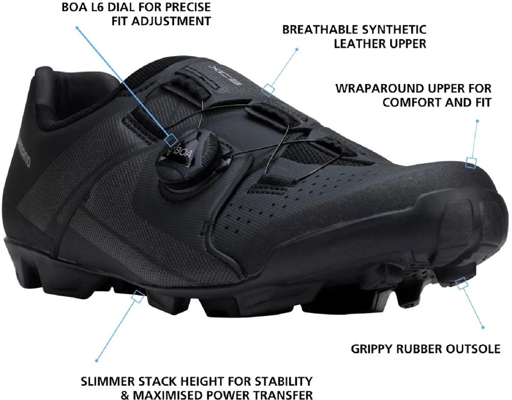 Built for cross-country trails where light weight and efficiency matter, the men’s wide Shimano XC3 mountain bike shoes are a high-performance choice that are comfortable to wear on and off the bike.